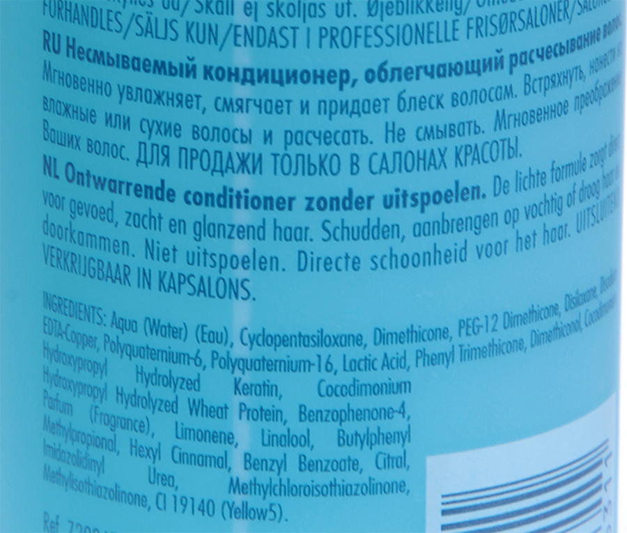 AQUA/WATER/ EAU, CYCLOPENTASILOXANE, DIMETHICONE, PEG-12-DIMETHICONE, DISILOXANE, GLUCONOLACTONE, DISODIUM EDTA-COPPER, POLYQUATERNIUM-6, LACTIC ACID, POLYQUATERNIUM-16, PHENYLTRIMETHICONE, DIMETHICONOL, COCODIMONIUM HYDROXYPROPYL HYDROLYZED WHEAT PROTEIN, COCODIMONIUM HYDROXYPROPYL HYDROLYZED KERATIN, BENZOPHENONE-4, PERFUME (FRAGRANCE), LIMONENE, LINALOOL, HEXYLCINNAMAL, BENZYL BENZOATE, CITRAL, SODIUM BENZOATE, YELLOW 5 (CI 19140). B03601.