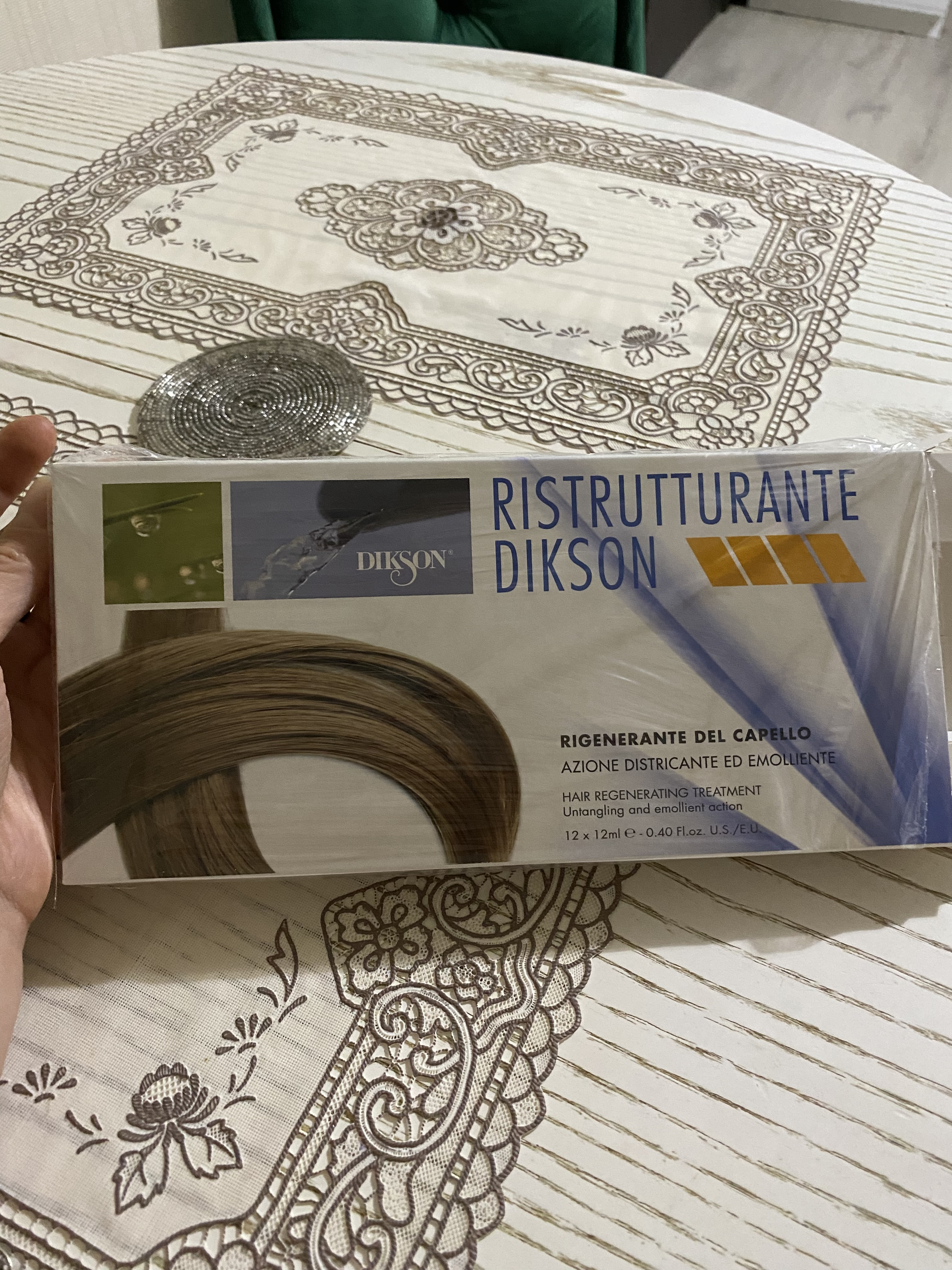 Реструктурирующий комплекс для восстановления повреждённых волос Dikson Ristrutturante применяется для избавления от пористости у вьющихся непослушных локонов, а также прядей, повреждённых частым окрашиванием, укладками, агрессивными моющими составами. Средство содержит аминокислоты и белки, которые заполняют пористые участки, делая шевелюру плотной, упругой и роскошно красивой. Также комплекс может использоваться в случае запущенного состояния волос, когда необходимо не только придать им объём, эластичность и блеск, но и восстановить на длительное время.