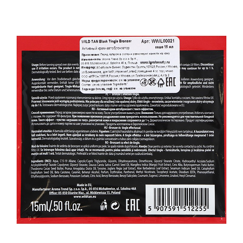 Крем-автобронзатор активный WILD TAN Black Tingle Bronzer - бронзатор с тингл-эффектом и маслом какао. Специальная формула, насыщающая кислородом, усиливает и углубляет цвет загара. ДГА - бронзирующий ингредиент, метилникотинат - тингл-эффект, масло какао - увлажняет и восстанавливает кожу, пантенол - снимает раздражения. Крем рекомендуется для уже загорелых, смуглых людей, для тех, чья кожа не чувствительна и кто регулярно посещает солярий.