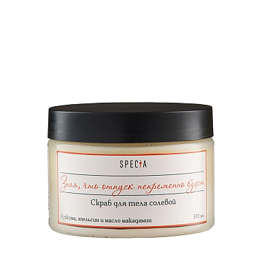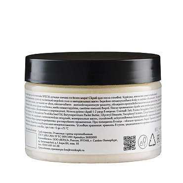 Дуэт из чистейшей морской соли и натуральных масел бережно отшелушивает кожу и глубоко увлажняет. Экстракт куркумы придает коже сияние, улучшает ее цвет, обеспечивает антиоксидантную защиту, обладает противовоспалительным действием. После применения скраба нет необходимости в нанесении крема – кожа станет гладкой, увлажненной и подтянутой.