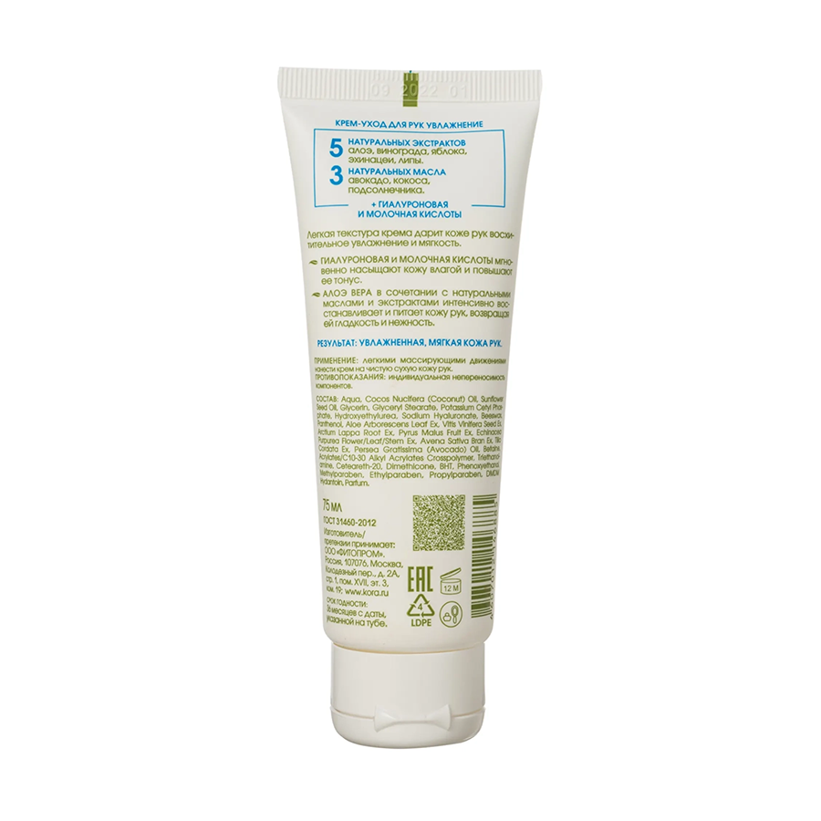 Aqua, Cocos Nucifera (Coconut) Oil, Sunflower Seed Oil, Glycerin, Glyceryl Stearate, Potassium Cetyl Phosphate, Hydrohyethylurea, Sodium Hyaluronate, Beeswax, Panthenol, Aloe Arborescens Leaf Extract, Vitis Vinifera Seed Extract, Arctium lappa Root Extract, Pyrus Malus Fruit Extract, Echinacea Purpurea Flower/Leaf/Stem Extract, Avena Sativa Bran Extract, Tilia cordata Extract, Persea Gratissima (Avocado) Oil, Vitis Vinifera (Grape) Seed Oil, Betaine, Acrylates/ C10-30 Alkyl Acrylates Crosspolymer, Triethanolamine, Ceteareth-20, Dimethicone, ВНТ, Phenoxyethanol, Methylparaben, Ethylparaben, Propylparaben, DMDM Hydantoin, Parfum.