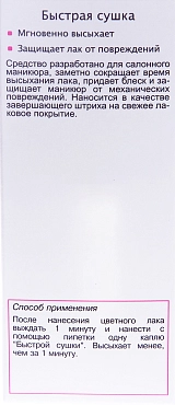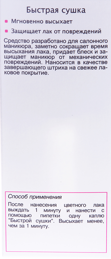 Способ применения: После нанесения цветного лака выждать 1 минуту и аккуратно нанести одну каплю «Быстрой сушки». Высыхает менее чем за 1 минуту.
