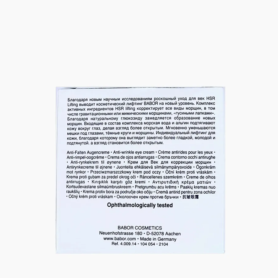 Лифтинг-уход для кожи вокруг глаз HSR с мгновенным эффектом. Роскошный крем для век против морщин обеспечивает заметное разглаживание морщин в области глаз, устраняет тёмные круги и отёчность, а также прицельно замедляет образование новых складок и заломов. Кожа выглядит более гладкой, плотной и упругой; взгляд кажется более открытым и отдохнувшим. Особенно нежная текстура комфортно ощущается на чувствительной коже этой зоны и создаёт уникальные впечатления от ухода при каждом применении.