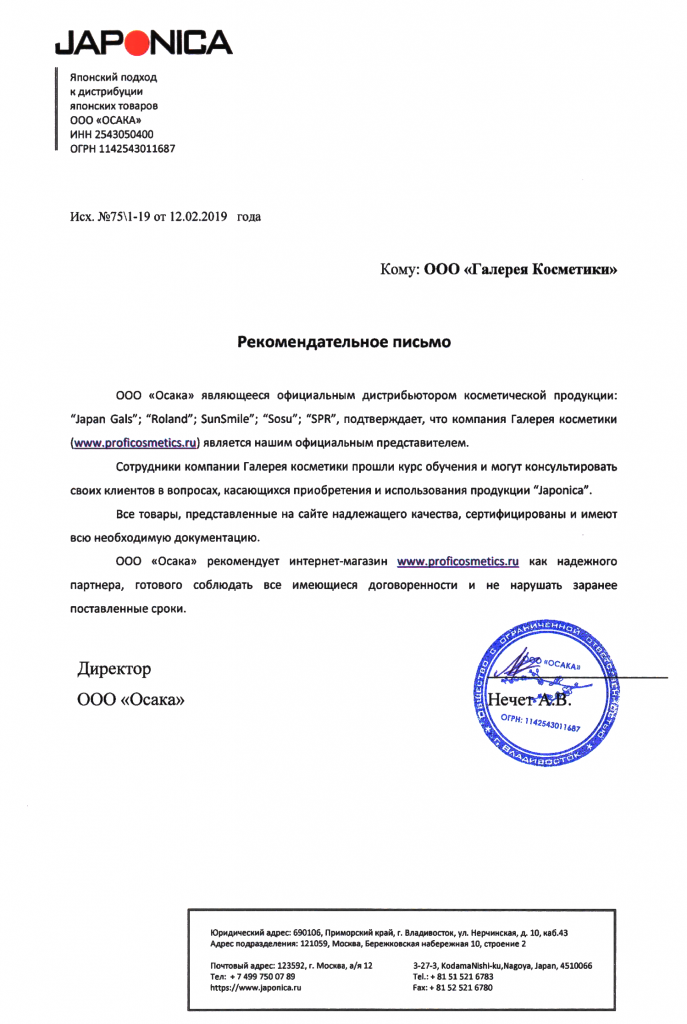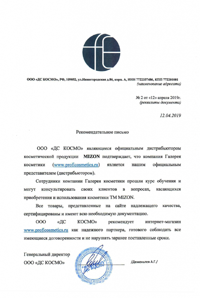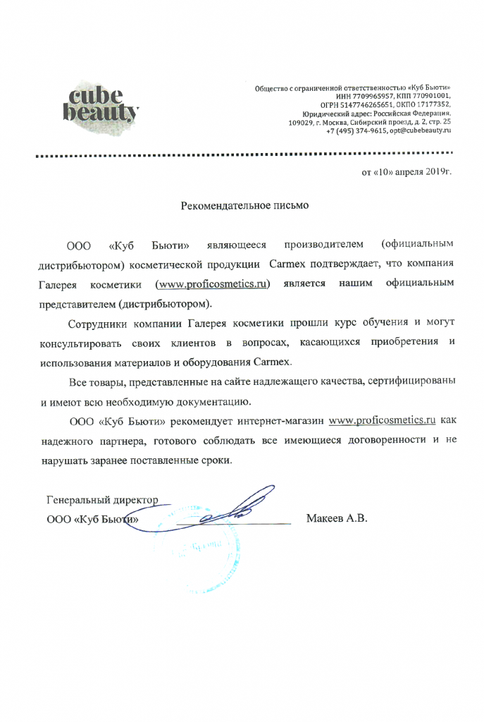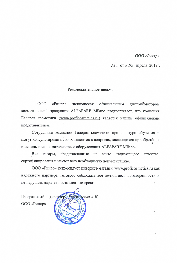 Вы можете ознакомиться с представленными нами официальными партнерскими письмами от ведущих торговых марок бьюти-индустрии, которые рекомендуют «Галерея косметики» как надежного партнера.